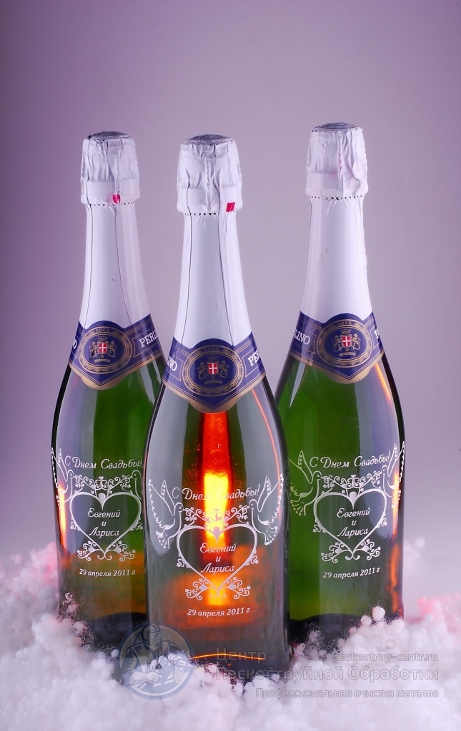 Нанесение пескоструйного рисунка на шампанском